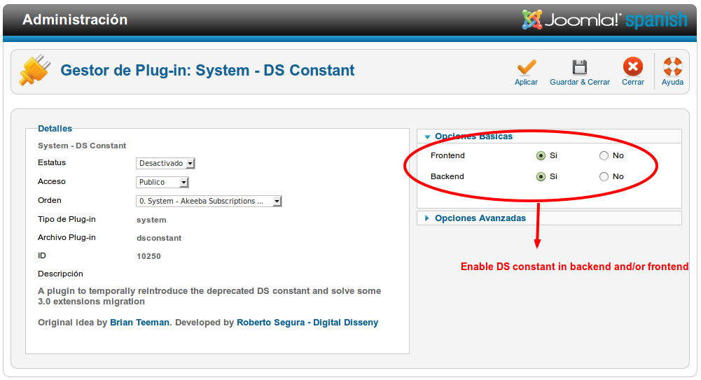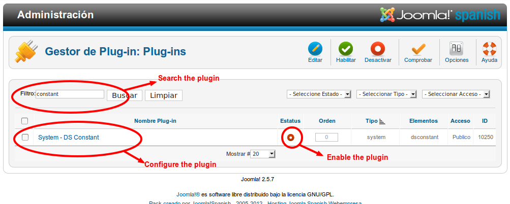 - Ve a Extensiones > Gestor de Plugins y busca por un plugin con el nombre "System - DS Constant". Actívalo: